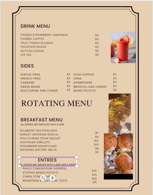 Our second page of our menu will rotate monthly with new dishes and new ideas!